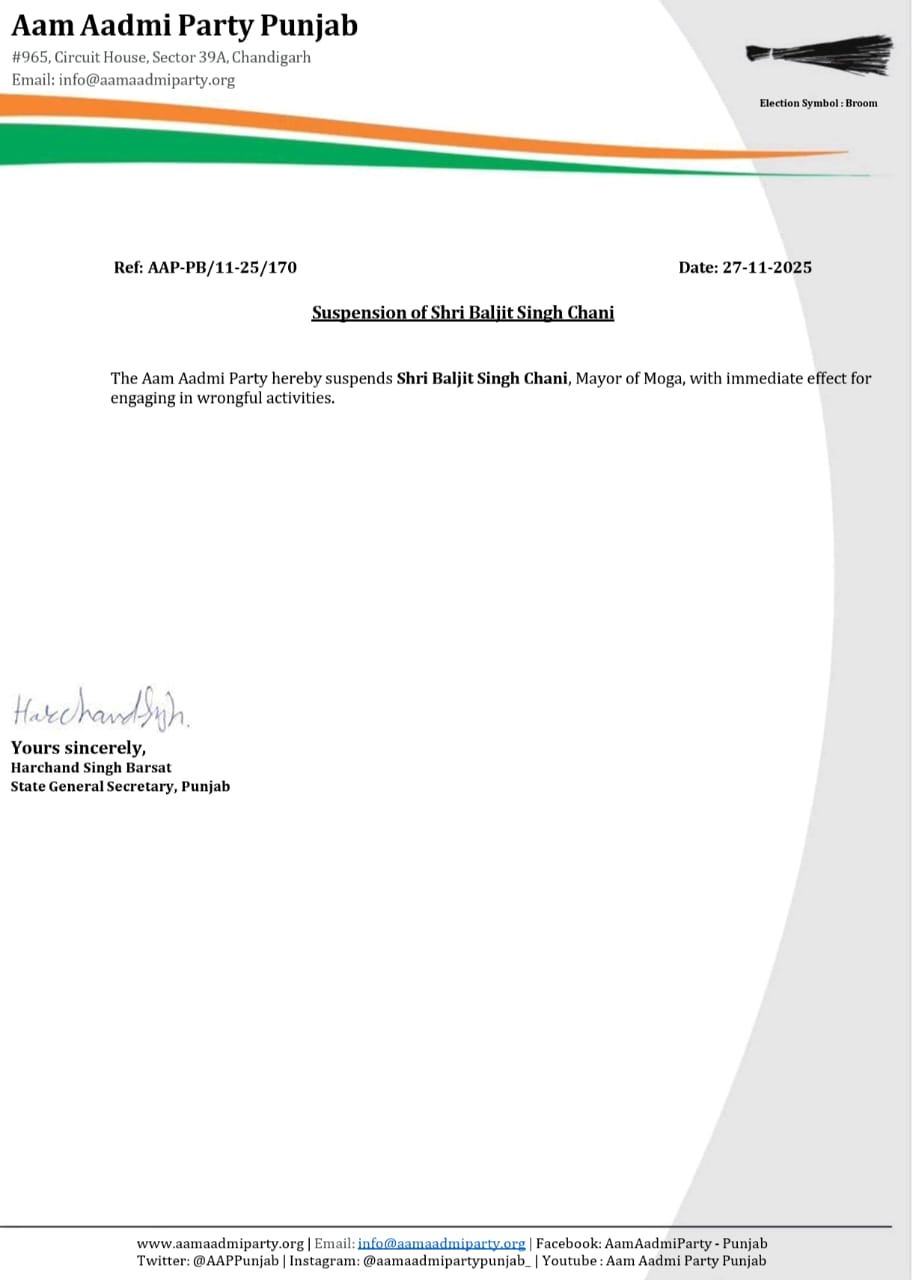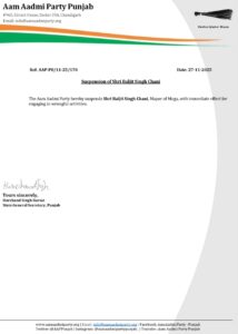 मोगा (Public Updates TV): पंजाब की राजनीति में बड़ा घटनाक्रम सामने आया है। आम आदमी पार्टी ने मोगा के मेयर बलजीत सिंह चानी को पार्टी-विरोधी और संदिग्ध गतिविधियों में शामिल होने के आरोपों के चलते पार्टी से बाहर का रास्ता दिखा दिया।
