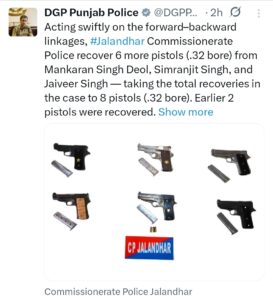 जालंधर (Public Updates TV): पंजाब में संगठित अपराध और अवैध हथियारों की सप्लाई चेन पर कड़ा प्रहार करते हुए जालंधर पुलिस ने जग्गू भगवानपुरिया गैंग से जुड़े तीन बदमाशों से 6 पिस्तौल (.32 बोर) बरामद की हैं। यह जानकारी पंजाब पुलिस के डीजीपी गौरव यादव ने दी।
