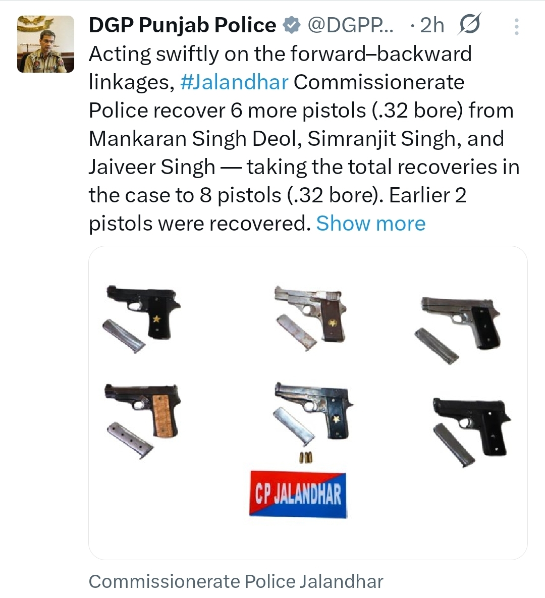 जालंधर (Public Updates TV): पंजाब में संगठित अपराध और अवैध हथियारों की सप्लाई चेन पर कड़ा प्रहार करते हुए जालंधर पुलिस ने जग्गू भगवानपुरिया गैंग से जुड़े तीन बदमाशों से 6 पिस्तौल (.32 बोर) बरामद की हैं। यह जानकारी पंजाब पुलिस के डीजीपी गौरव यादव ने दी।
