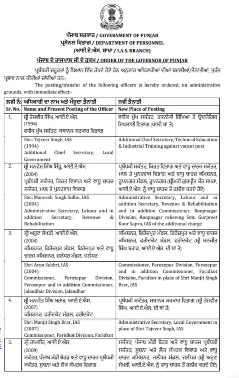 चंडीगढ़ (Public Updates TV): पंजाब सरकार ने प्रशासनिक कामकाज को तेज और सुचारू बनाने के लिए बड़ा फेरबदल किया है। शनिवार को जारी आदेशों में 7 IAS और 1 PCS अधिकारी का तबादला किया गया है। इन तबादलों के साथ कई जिलों और महत्वपूर्ण विभागों की जिम्मेदारियों में बदलाव होगा।