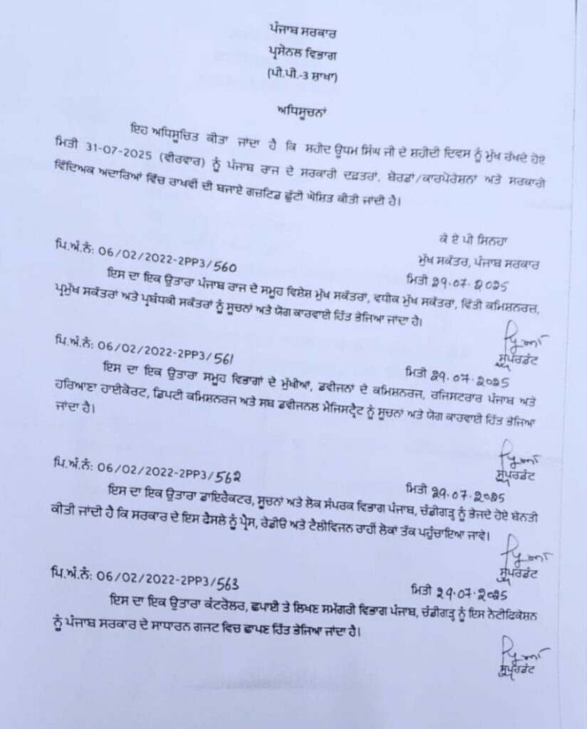 चंडीगढ़ (Public Updates TV): पंजाब सरकार ने 31 जुलाई को शहीद उधम सिंह के शहीदी दिवस पर पूरे राज्य में सरकारी छुट्टी घोषित कर दी है। कैबिनेट मंत्री अमन अरोड़ा ने प्रेस कॉन्फ्रेंस में बताया कि इस दिन सभी सरकारी दफ्तर, स्कूल और कॉलेज बंद रहेंगे।