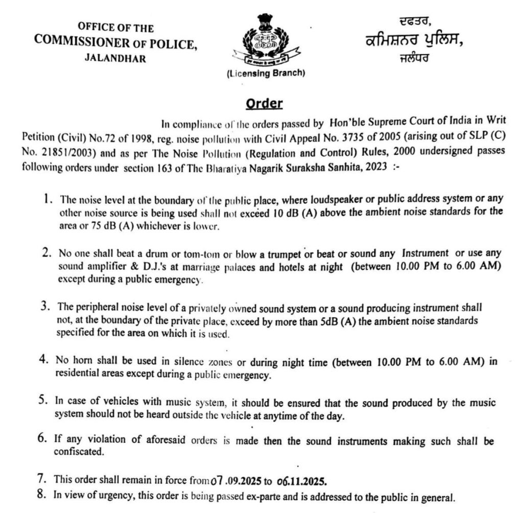 जालंधर (Public Updates TV): शहर में कानून-व्यवस्था बनाए रखने और शांति भंग की संभावनाओं पर अंकुश लगाने के उद्देश्य से पुलिस कमिश्नर धनप्रीत कौर ने सख्त आदेश जारी किए हैं। भारतीय नागरिक सुरक्षा संहिता, 2023 की धारा 163 के अंतर्गत प्राप्त अधिकारों का प्रयोग करते हुए उन्होंने निर्देश दिए हैं कि कमिश्नरेट पुलिस क्षेत्र में आने वाले सभी रेस्टोरेंट, क्लब और अन्य लाइसेंस प्राप्त खाने-पीने के स्थानों को रात 12 बजे तक पूरी तरह बंद करना अनिवार्य होगा।