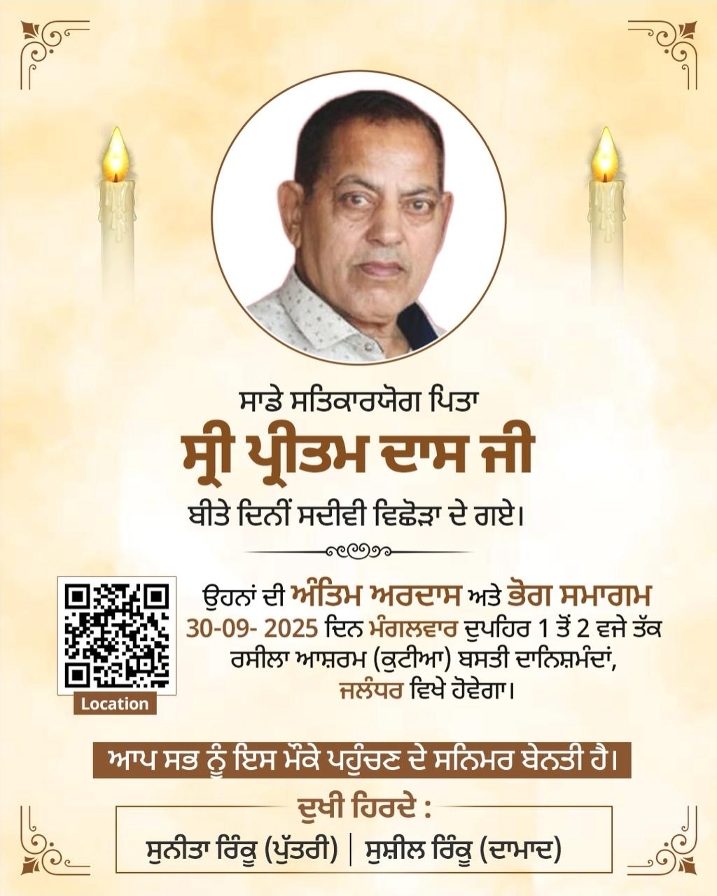 उनकी आत्मिक शांति के लिए अंतिम अरदास और भोग समागम का आयोजन मंगलवार, 30 सितंबर 2025 को दोपहर 1 से 2 बजे तक बस्ती दानिशमंदा स्थित रसीला आश्रम (कुटिया) में किया जाएगा।